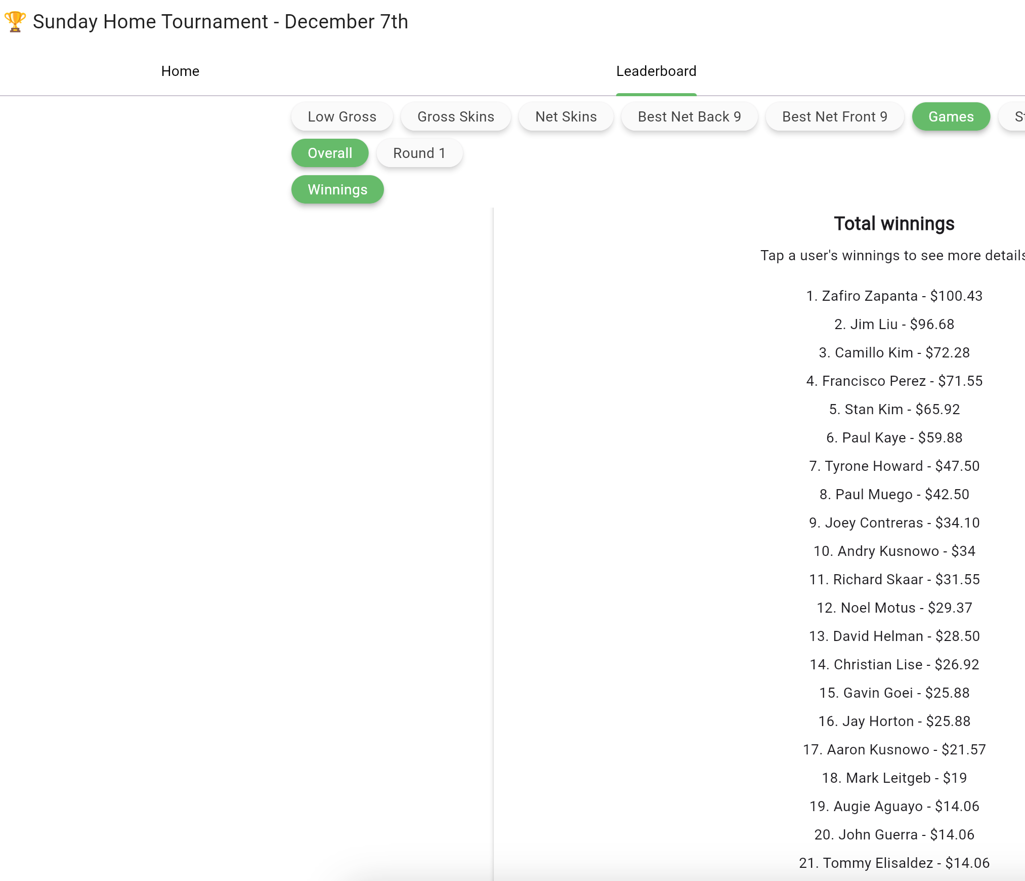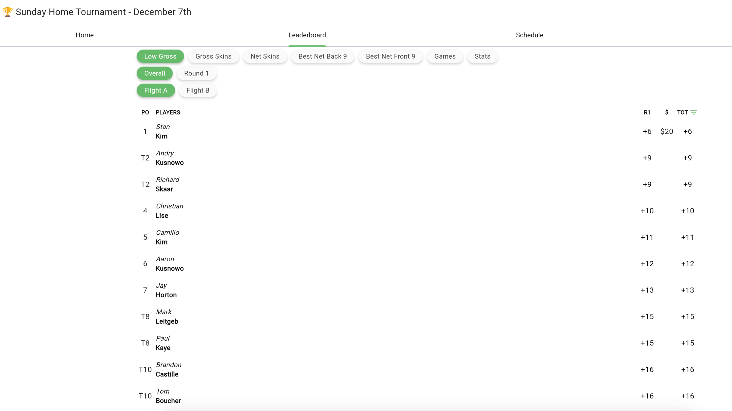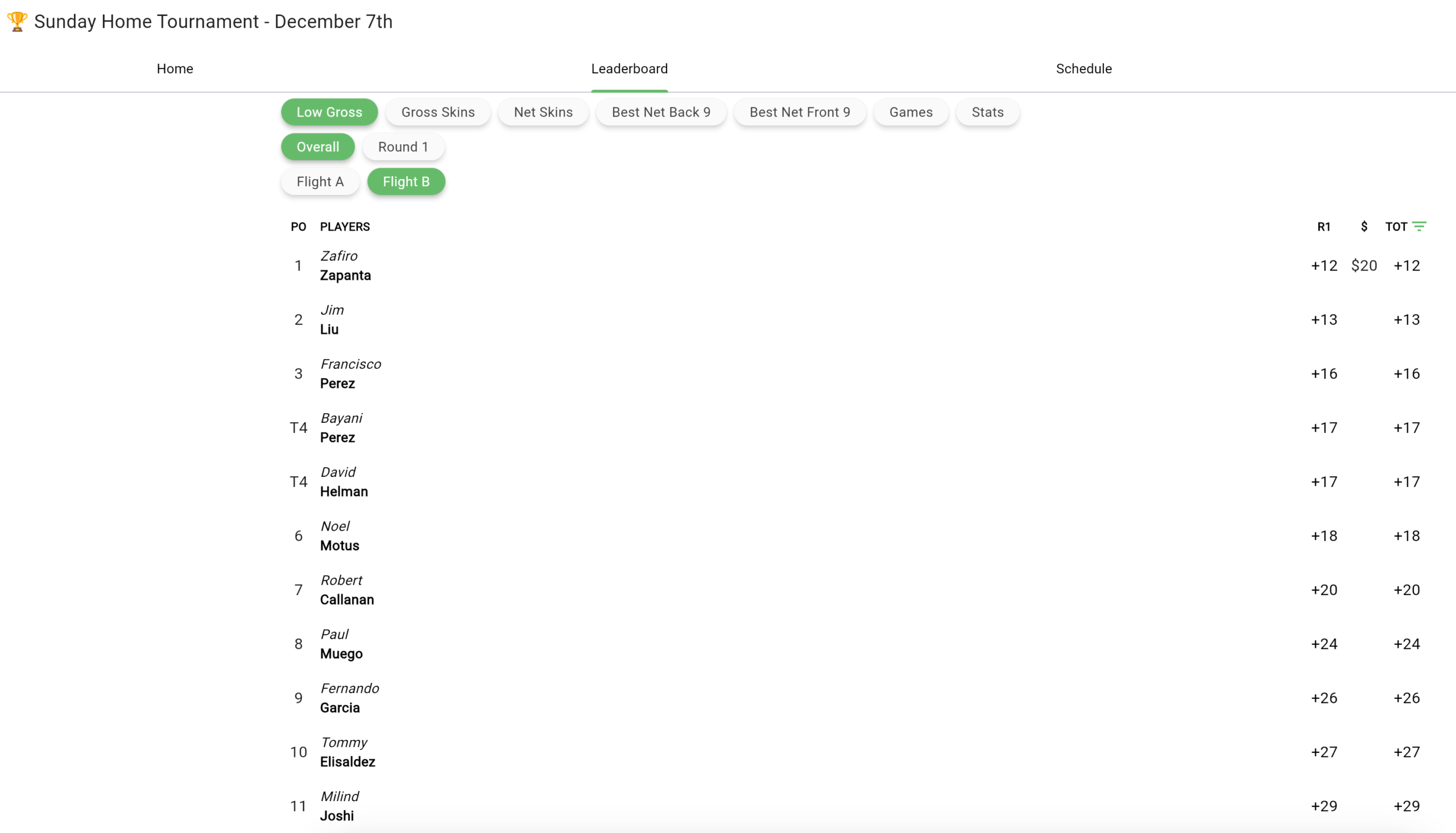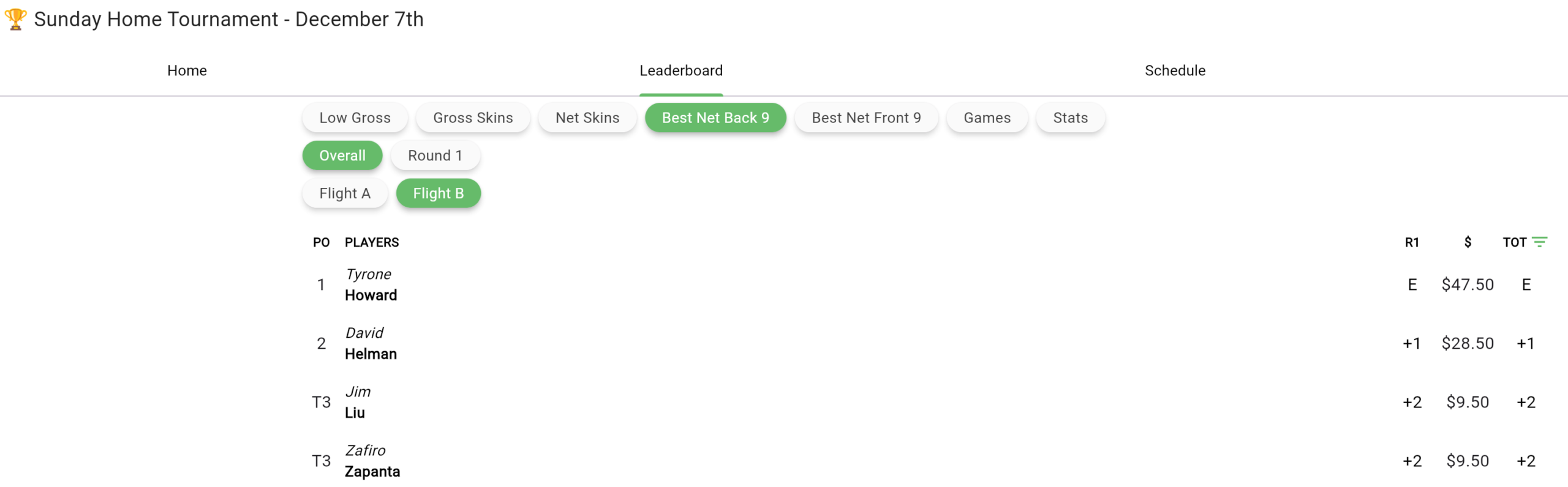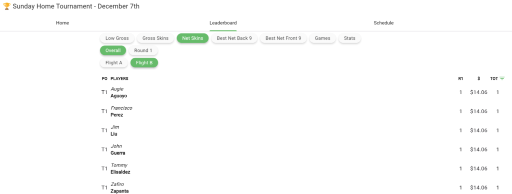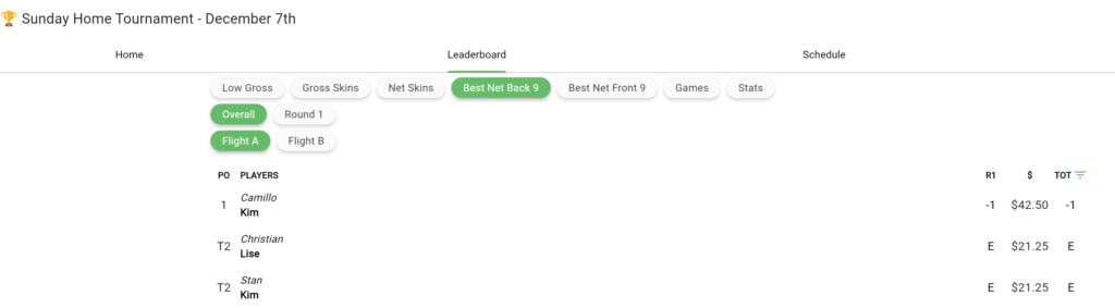 Dec 7th Home Tournament Results