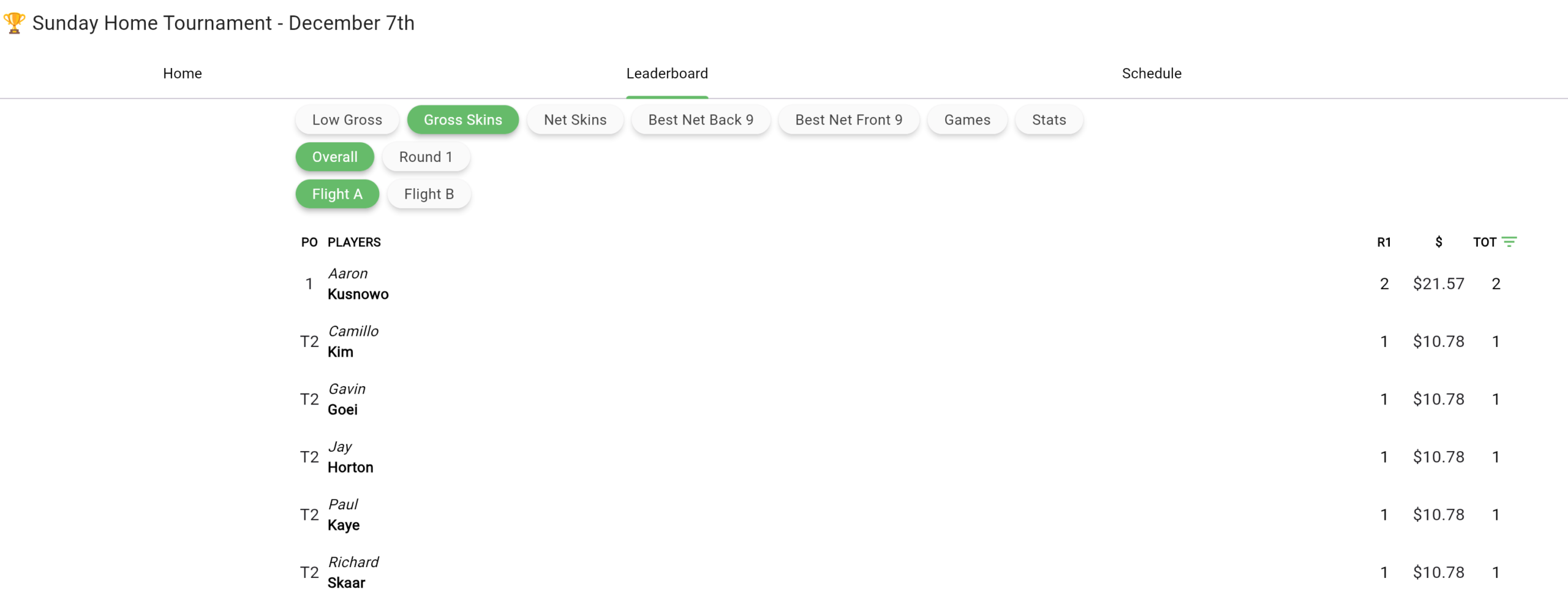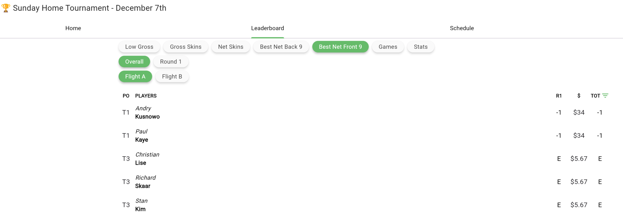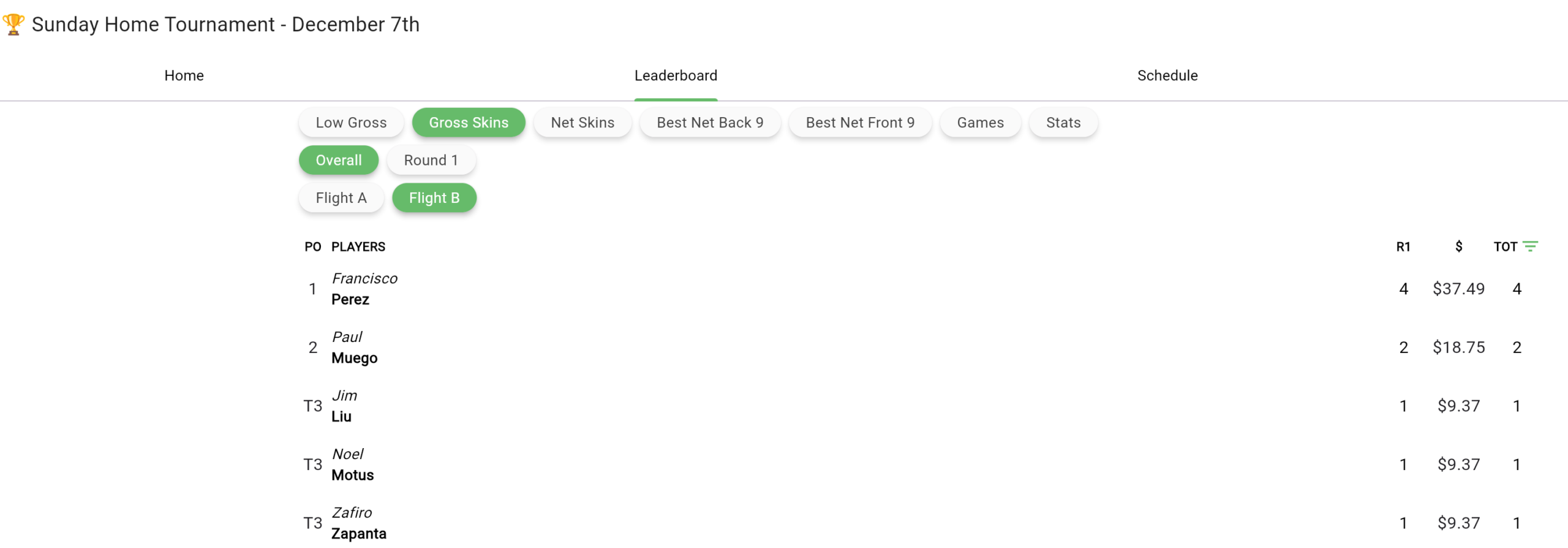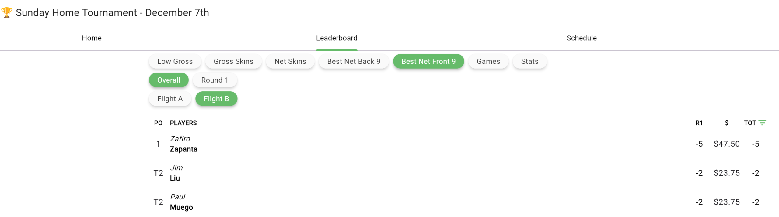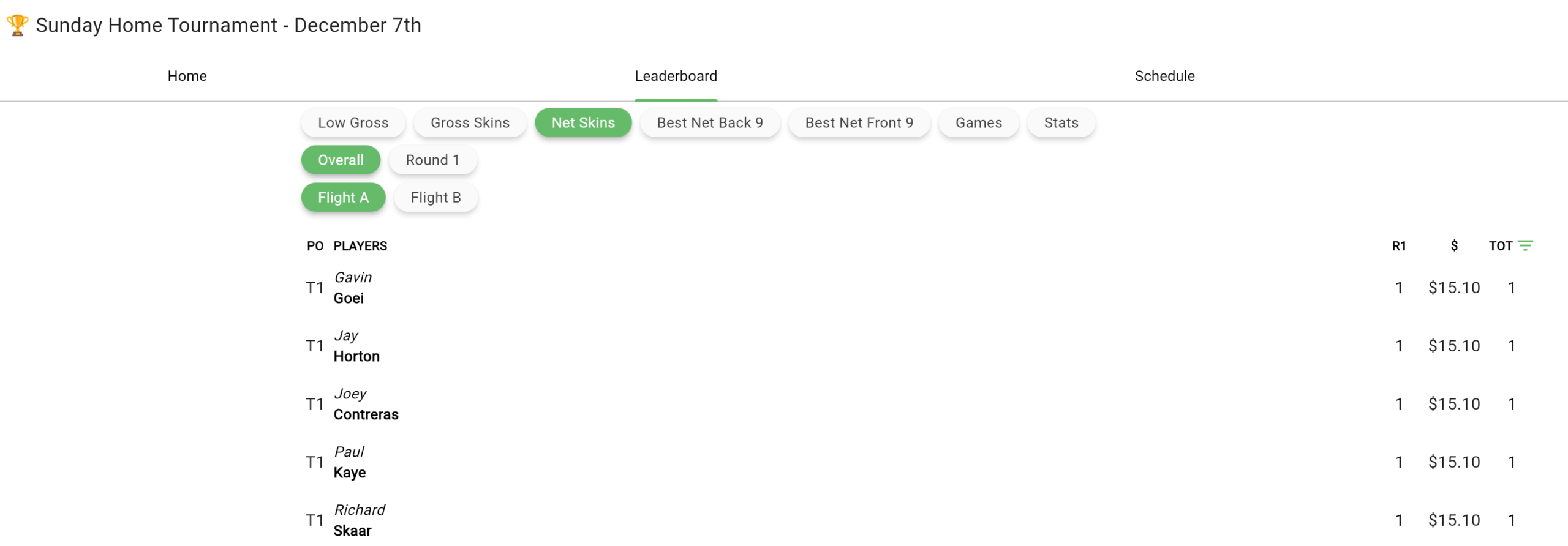 Dec 7th Home Tournament Results